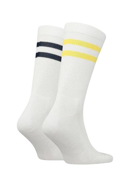 Chaussettes Levis. Modèle Regular Cut Sport. Couleur blanc. Deux bandes latérales. Détails en jaune et bleu marine. Élastique Partie supérieur. Tissu en coton doux.