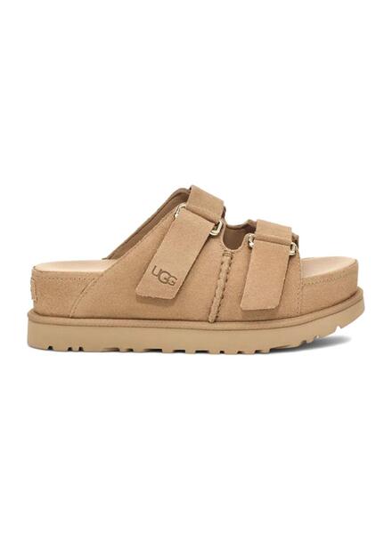 Sandales UGG. Modèle Goldenstar. Couleur chameau. Marque gravée. Double sangle réglable avec boucle. Semelle en EVA. Plateforme de 7 cm de hauteur.