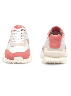 Chaussures Lacoste. Tige en maille et cuir. Couleur blanche avec des détails roses. Semelle intermédiaire en EVA. Semelle en caoutchouc. Détail du crocodile sur le côté.
