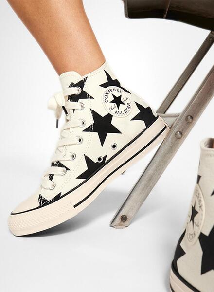 Chaussures Converse. Modèle Chuck Taylor All Star. Couleur beige. Dessus en toile. Amorti OrthoLite. Imprimé de grandes étoiles en noir. Patch Chuck Taylor sur la cheville. Logo All Star.