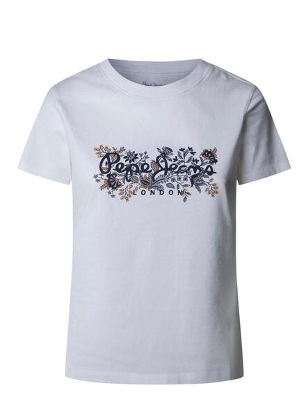 T-shirt Pepe Jeans. Modèle Rosalind. Couleur blanc. Col rond. Manches courtes. Coupe régulière. Logo imprimé sur la poitrine avec des motifs floraux en bleu marine et orange.