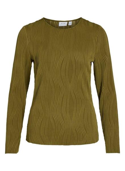 Top Vila. Coupe régulière. Col rond. Manches longues. Couleur verte. Tissu avec motif en relief ton sur ton.
