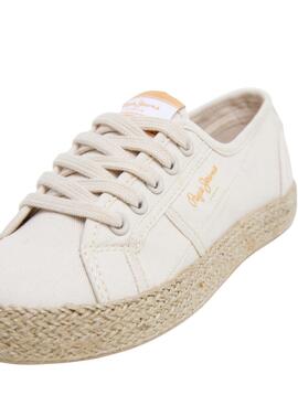 Chaussures Pepe Jeans. Modèle Brady. Couleur beige. Dessus en toile de coton. Fermeture à lacets. Logo imprimé sur le côté. Semelle en caoutchouc. Semelle intermédiaire en jute.