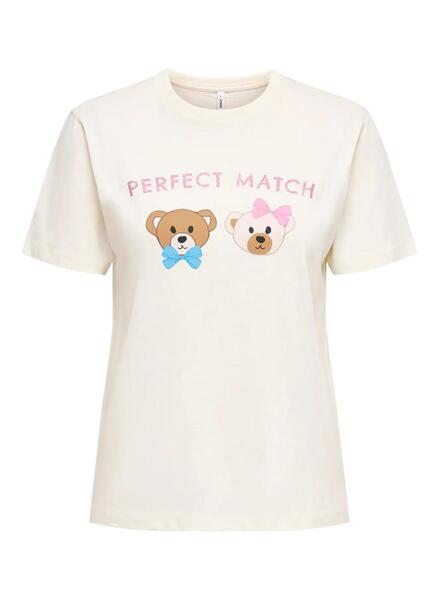 T-shirt Only. Modèle Ketty. Couleur beige. Col rond. Manches courtes. Coupe régulière. Illustration imprimée sur la poitrine avec le message Perfect Match.