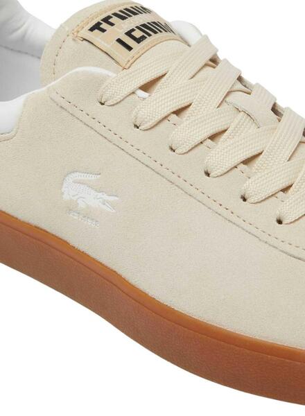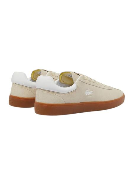 Chaussure Lacoste. Modèle Baseshot. Couleur beige. Dessus en daim. Doublure en tissu et synthétique. Semelle en caoutchouc contrastante. Crocodile en relief sur le côté.