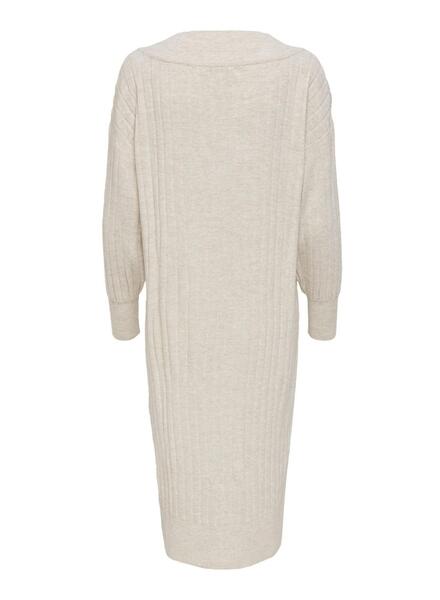Robe Only. Modèle New Tessa. Coupe midi. Col en V. Couleur beige. Robe en maille côtelée. Manches longues. Poignets élastiques.