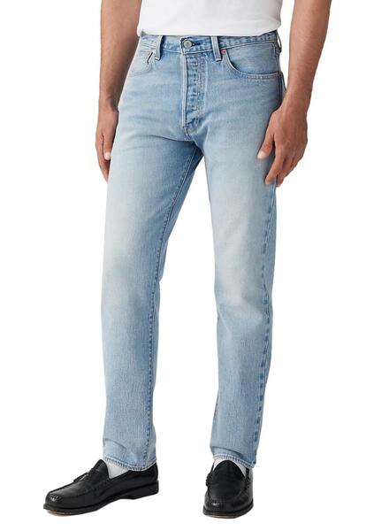Jean Levi's. Modèle 501 Slim. Denim clair. Cinq poches. Style classique. Effet lavé. Étiquette de la marque à la taille.