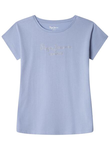 T-shirt Pepe Jeans. Modèle Nuria. Couleur bleu clair. Col rond. Manches courtes. Logo avec strass sur la poitrine. Coupe régulière.