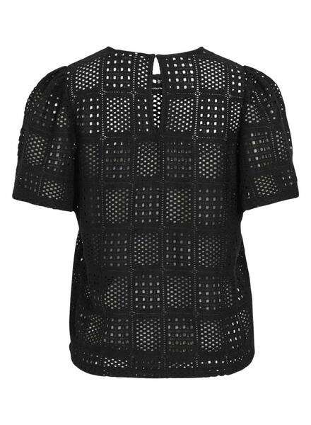Haut Vila. Couleur noire. Col rond. Manches courtes. Tissu perforé. Sans doublure. Coupe régulière. Petite ouverture arrière avec bouton. Manches bouffantes. Le modèle porte la taille S.