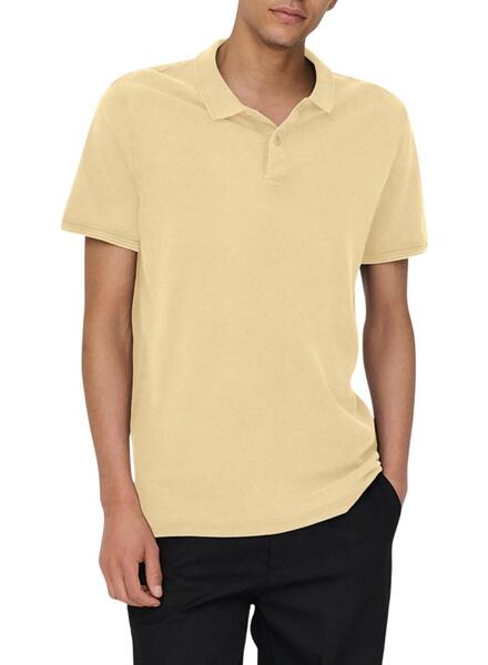 Polo Only and Sons. Modèle Travis. Couleur jaune. Col chemise avec deux boutons. Manches courtes. Coupe slim. Style basique. Étiquette latérale de la marque.
