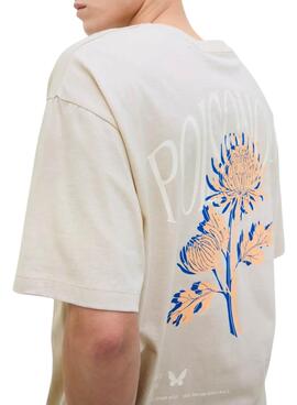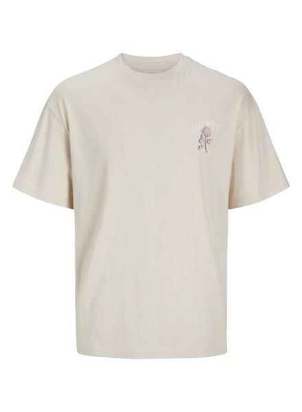 T-shirt Jack and Jones. Modèle Charge. Couleur beige. Col rond. Manches courtes. Illustration avec message imprimé sur la poitrine et dans le dos en bleu et orange. Coupe ample.