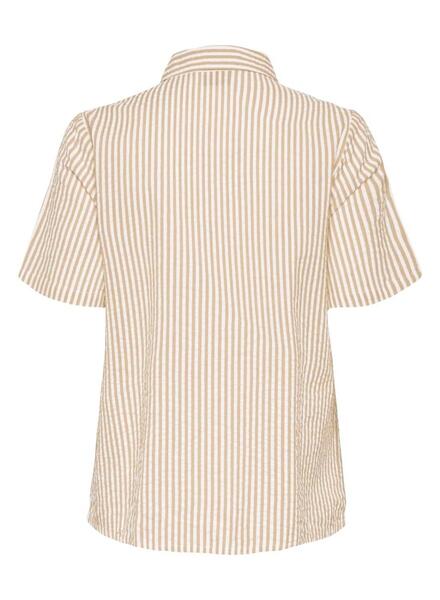 Chemise Pieces. Modèle Sally. Couleur beige et moutarde. Tissu à rayures verticales. Col chemise. Effet froissé. Manches courtes. Fermeture avec des boutons. Coupe carrée.