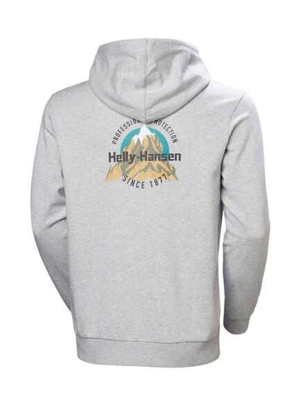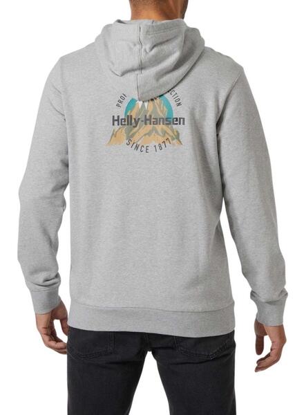 Sweat à capuche Helly Hansen. Modèle Core Graphic. Couleur gris. Tissu chiné. Capuche avec cordon ajustable. Poche kangourou. Extrémités côtelées. Logo imprimé sur la poitrine. Illustration de montagne imprimée dans le dos.